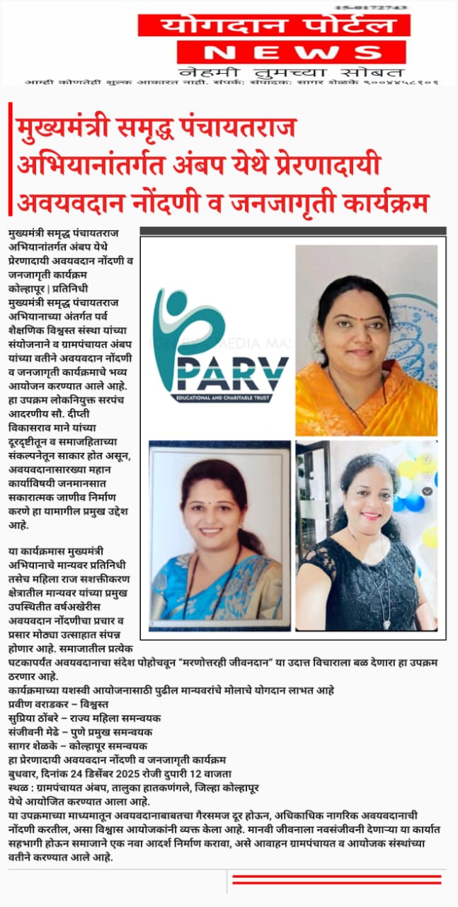 ग्रामपंचायत अंबप (ता. हातकणंगले, जि. कोल्हापूर) यांच्या वतीने मुख्यमंत्री समृद्ध पंचायत राज अभियान अंतर्गत अवयव दान व नेत्रदान नोंदणी कार्यक्रम आयोजित करण्यात आला आहे. अवयवदान व नेत्रदानाच्या संकल्पनेतून गरजू रुग्णांना जीवनदान व अंध व्यक्तींना दृष्टी मिळू शकते, हा जनजागृतीचा उद्देश आहे. हा कार्यक्रम २४ डिसेंबर २०२५ रोजी दुपारी १२ वाजता ग्रामपंचायत कार्यालय, अंबप येथे होणार असून, नोंदणीसाठी आधार कार्ड आवश्यक आहे. विविध मान्यवरांच्या प्रमुख उपस्थितीत हा सामाजिक उपक्रम राबविण्यात येत आहे.